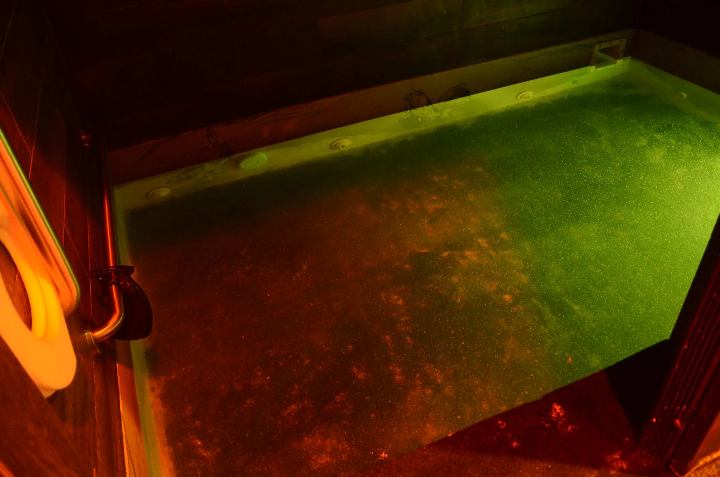 Your pool is approximately 5’x9’ with an 8 foot ceiling. The pool has graphics along the water line that makes you feel as if you are floating in a lake. As you float on your back, you will view a picturesque lakeside scene, which will help you let go, relax and you enjoy your time in the Floating Forest.